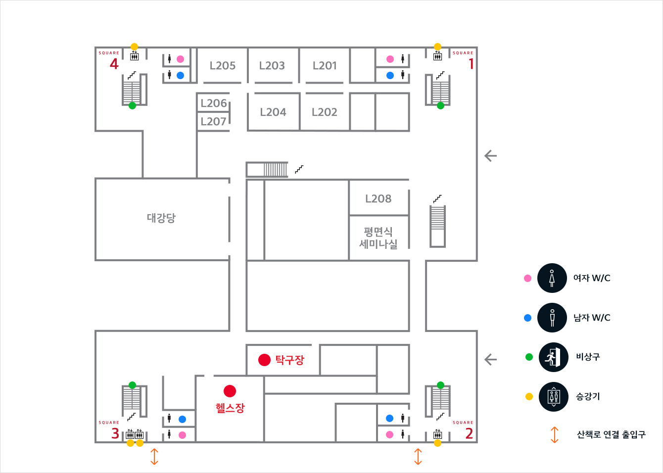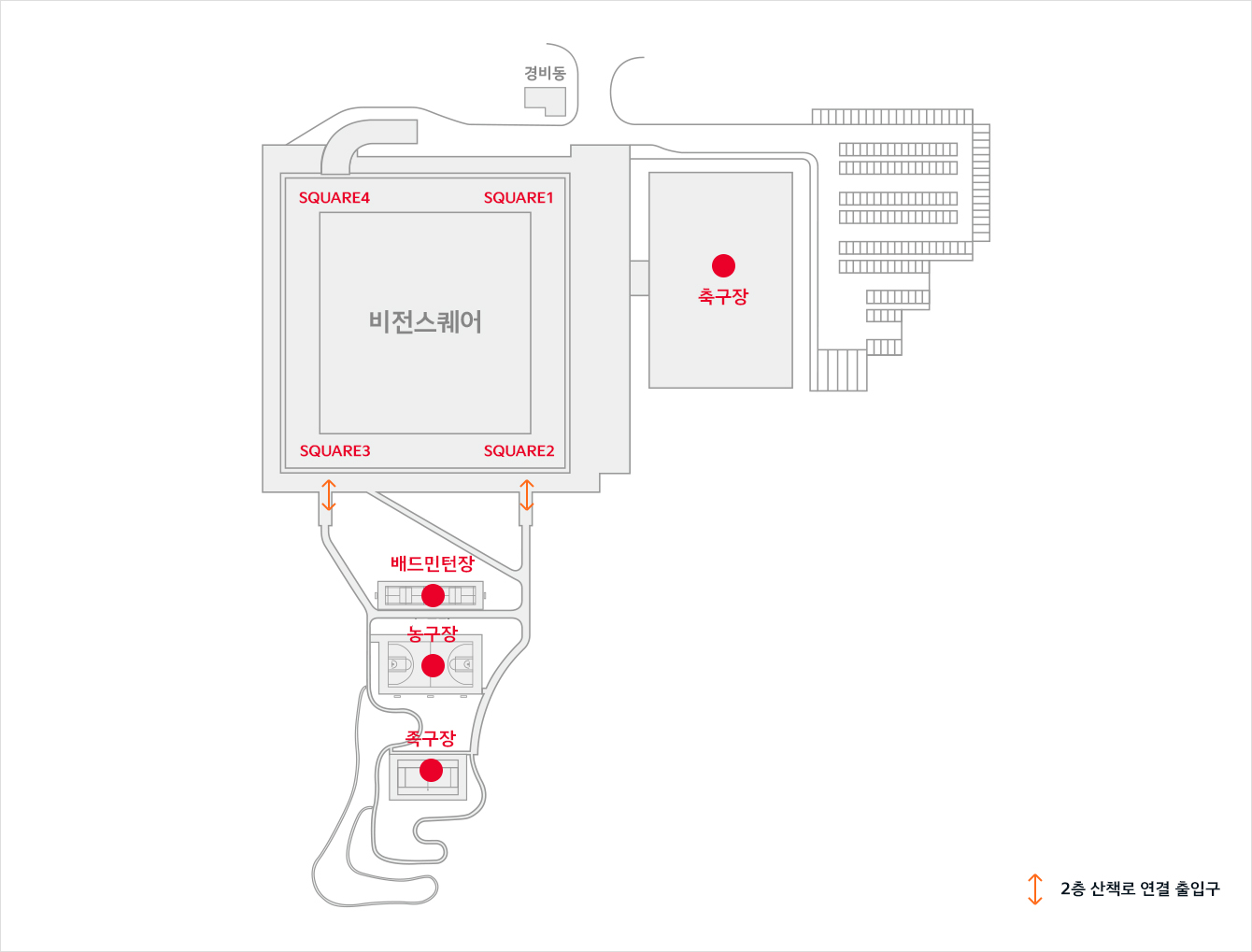 운동시설 안내 운동시설은 실외 및 실내에 위치 운동시설 설명보기 실외 시설 : 축구장, 배드민턴장, 농구장, 족구장 배드민턴장, 농구장, 족구장은 2층 산책로 연결 출입구를 통해 이동 할 수 있음 실내 시설 : 탁구장, 헬스장은 2F에 위치 (SQUARE3 부근)