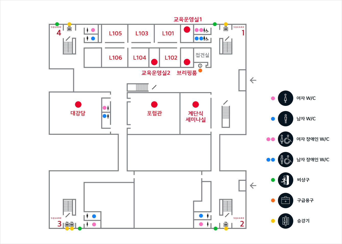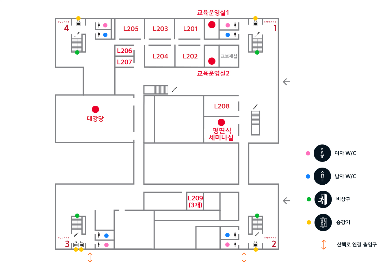교육시설 안내 교육 시설은 1F, 2F에 위치 교육시설 설명보기 1F : 대강당, 포럼관, 계단식 세미나실, 대강의실, 중강의실, 브리핑룸, 교육운영실 2F : 대강당, 평면식 세미나실, 대강의실, 교육운영실